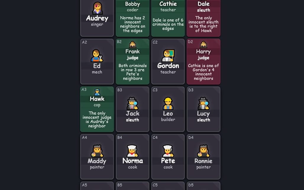 - Qui est-ce ? Voilà un jeu pas tout récent mais je tenais à mentionner Clues By Sam, qui s'est lancé il y a quelques mois. Il s'agit d'un jeu quotidien sur navigateur inspiré par Wordle, mais qui ne repose pas sur les mots : il faut réussir à déterminer qui sont les criminels et les innocents parmi les personnages d'une grille, chaque bonne réponse donnant un indice pour le suivant comme "deux des voisins de Donna sont criminels." Ce qui fait toute la différence : toute déduction repose sur la logique, aucune proba, on ne "devine" rien. Si vous avez un esprit pragmatique, vous allez adorer.